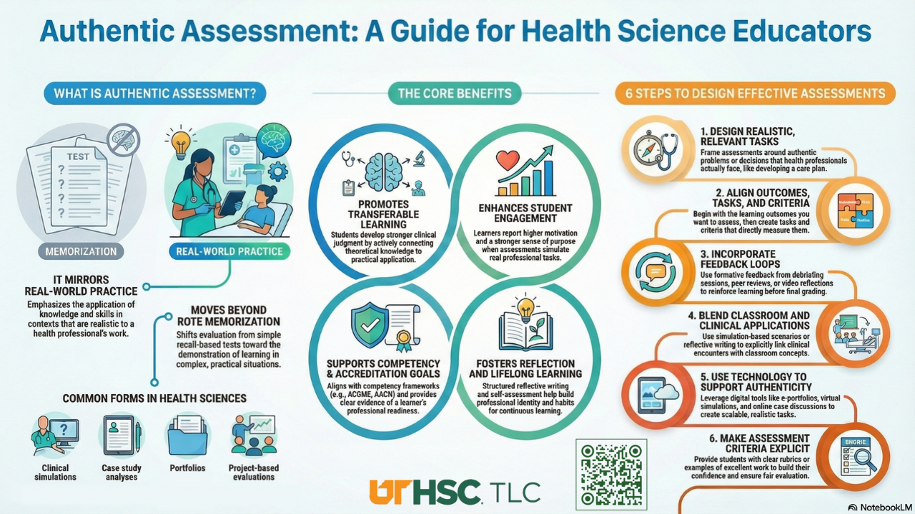 In both didactic and clinical environments, authentic assessment supports deeper learning, promotes reflective practice, and enhances students’ readiness for professional roles. It shifts evaluation from recall-based testing toward demonstration of learning in complex, realistic situations that reflect professional standards and values.